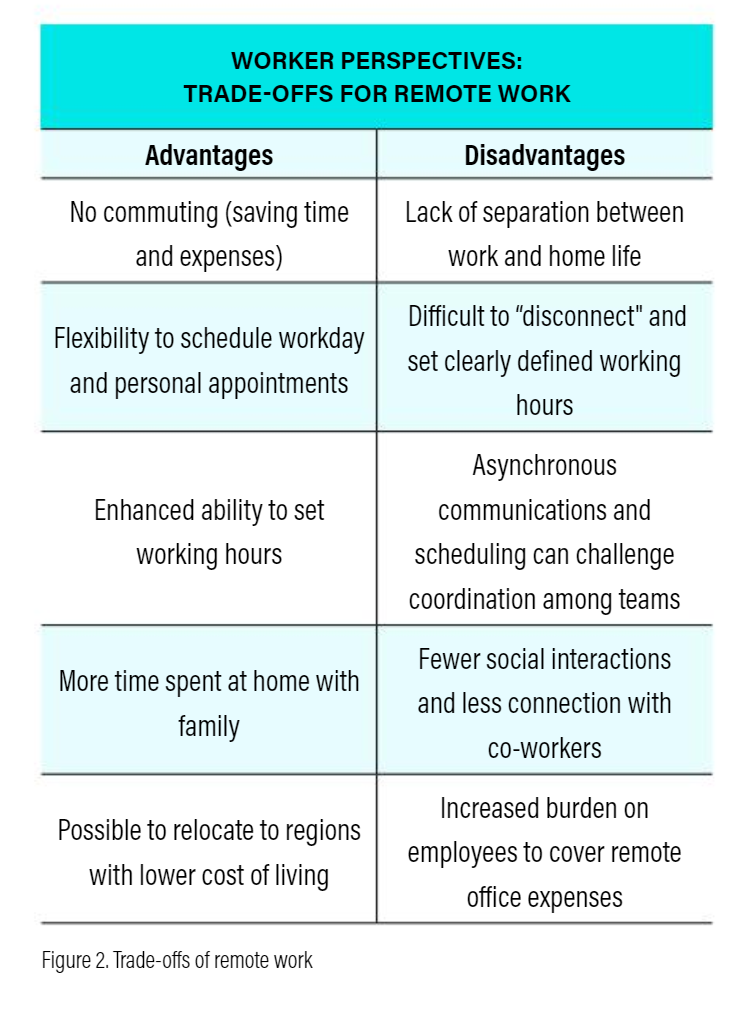 It is unlikely, however, that employees will want to give up remote work altogether because of the flexibility, opportunity to combine work with caregiving responsibilities at home, and high levels of work satisfaction.